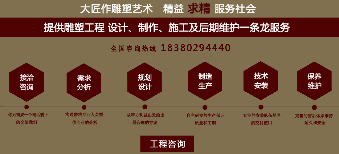 成都大匠作雕塑有限公司,是經(jīng)成都工商局審定注冊的正規(guī)專業(yè)雕塑制作及工程安裝服務機構,是由一群年輕富有朝氣的年輕人創(chuàng)辦,發(fā)軔于四川省成都市龍泉驛區(qū)。它是一家******于創(chuàng)作、制作和銷售為一體的公司。大匠作擁有多年從事公共藝術的專業(yè)人員和雕塑制作人組成的核心團隊,為您提供專業(yè)、具創(chuàng)新的設計及制作服務。公司成立以來,秉承“******服務、誠信為本”的宗旨,以客戶需求為目標導向,不斷學習,進取,優(yōu)化和提高服務質量,公司向您******——“您的滿意***是我們的信譽”,我們將以飽滿的熱情和******的服務贏得您的贊譽和支持。 愛心,細心,耐心,責任心是我們的要求,盡心盡職,為您打造出創(chuàng)新、專業(yè)、******的設計方案,我們堅信先做人、后做事,用心對待客戶,實行透明收費,人性化服務,本著對客戶負責,對客戶負責,更是對自己發(fā)展負責的態(tài)度,爭取做到讓每位客戶滿意